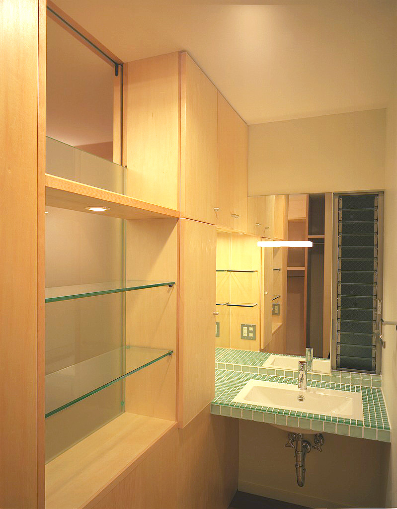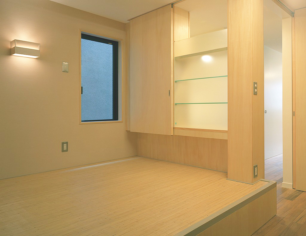 - ご夫婦の寝室の真裏にあり、フロストガラスで仕切った棚は双方に光を取り入れて閉じない明るい空間に。